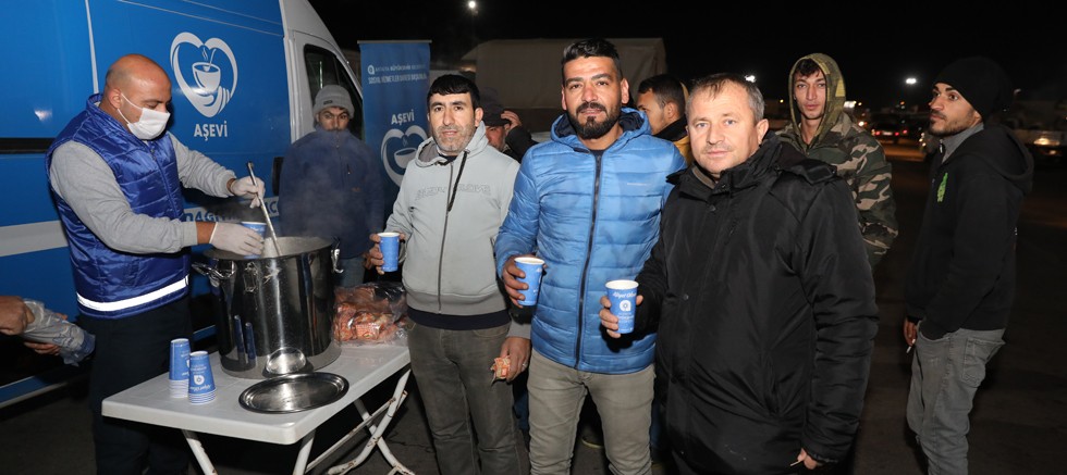Büyükşehir Belediyesi, soğuk kış aylarında sabahın erken saatlerinde ilçelerden Antalya Haline ürün getiren çiftçileri ve hal esnafını sıcak çorba ile ısıtıyor. Büyükşehir Belediyesi Sosyal Hizmetler Dairesi Başkanlığı’na bağlı Aşevinin mobil aracıyla hal girişine sabah 4’de kurulan stantta ücretsiz sunulan hizmet vatandaşlardan tam not alırken, çorbanın lezzeti memnuniyetle karışlanıyor.