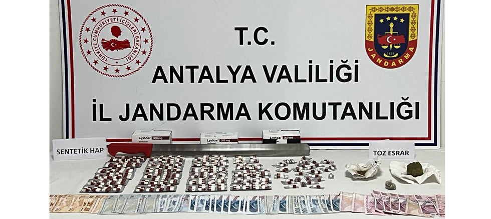 Antalya Valiliği İl Jandarma Komutanlığı ekiplerinin uyuşturucu madde imalatı ve ticareti yapan kişilere karşı çalışmaları aralıksız devam ediyor. Yapılan istihbarat çalışmaları sonucu harekete geçen jandarma ekiplerinin gerçekleştirdikleri operasyonda 1030 adet uyuşturucu sentetik Lyrica hap ve 150 gram toz esrarın ele geçirildiği belirtti.