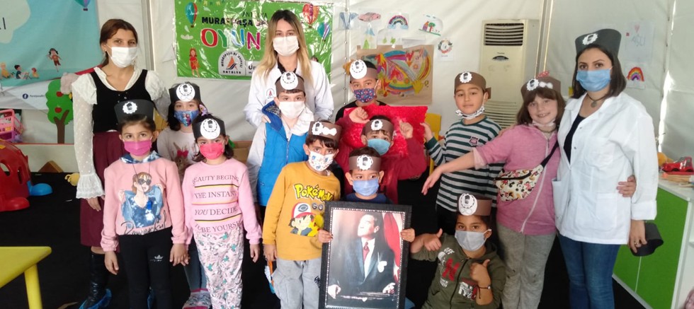 Muratpaşa Belediyesi’nin 30 Ekim’deki depremden etkilenen İzmir’in Bayraklı ilçesinde kurduğu kreş-oyun çadırı çocuklar için yuva oldu. Çocuklar, gelişimlerine uygun programlara katılırken 10 Kasım’da da, Önderimiz Gazi Mustafa Kemal Atatürk’ü anmak için özel bir etkinlik düzenledi.