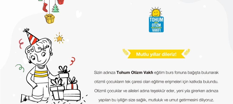 Tohum Otizm Vakfı bağış sertifikaları ile yeni yılda sevdiklerinizi mutlu ederken otizmli çocukların hayatına dokunabilir, onların gelecekleri için bir fırsat yaratabilirsiniz. Birbirinden özel dileklerin yer aldığı farklı tasarımlara sahip yeni yıl sertifikaları ile hem otizmli çocukları hem de sevdiklerinizi mutlu etme şansı yakalayacaksınız.