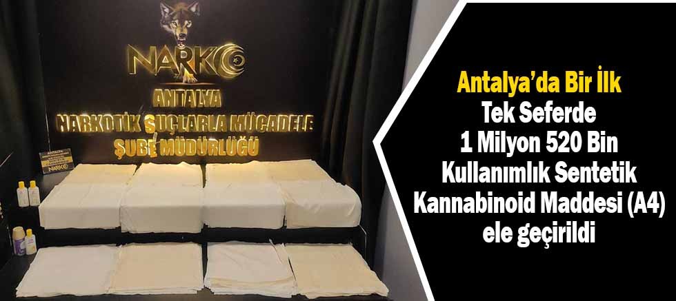 - Antalya'da bugüne kadar ele geçirilen, kullanım olarak en yüksek miktarda; yaklaşık 1 Milyon 520 Bin kullanımlık 245 adet Sentetik Kannabinoid Bonzai A4 maddesi ele geçirildi.