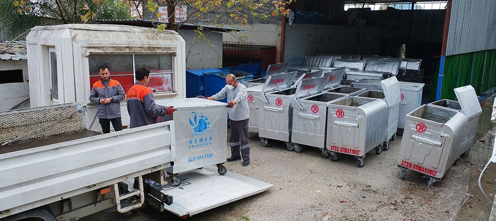 Kemer Belediyesi’ne ait atölyelerde yenilenen konteyner ve çöp kovaları ile hem görüntü kirliliğinin ortadan kaldırılması hem de tasarruf edilmesi sağlanıyor.