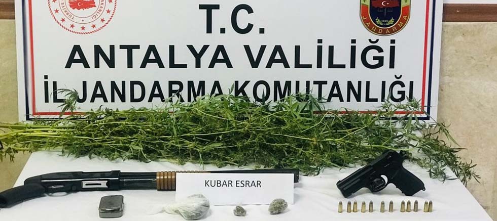Manavgat İlçesi Side Mahallesinde İ. K. isimli bir kişinin ikametinde Manavgat İlçe Jandarma Komutanlığına bağlı KOM Timi ve Side J.Krk.ligi ekiplerince yapılan aramada; 15 kök Skunk, 50 gram Kubar Esrar, 1 adet ruhsatsız 9 mm tabanca ve 12 adet fişek ile 1 adet ruhsatsız av tüfeği ele geçirildi.