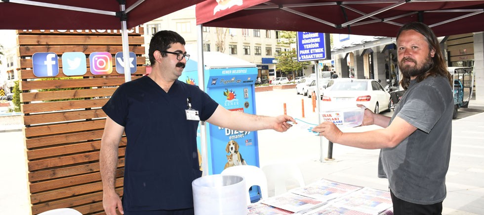 Kemer Belediyesi Sağlık İşleri Müdürlüğüne bağlı Hayvan Barındırma, Tedavi ve Rehabilitasyon Merkezinde görevli Veteriner Fevzi Uzun ve belediye personeli, Liman Caddesinde hayvanseverlere mama kabı ile broşür dağıttı.