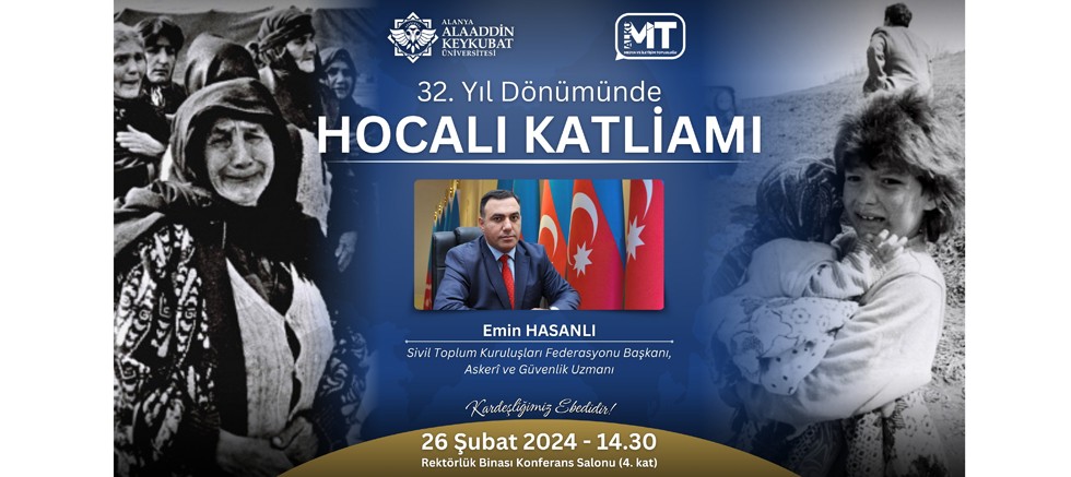 Alanya Alaaddin Keykubat Üniversitesinde (ALKÜ) düzenlenen konferanslarda Türk ve İslam dünyasındaki önemli olaylar bilinmeyen yönleriyle ve konunun uzmanları tarafından ele alınmaya devam ediyor. Ermeni güçlerinin 26 Şubat 1992'de Hocalı'da kadın, çocuk ve yaşlı gözetmeksizin yaptığı katliamın kurbanları Azerbaycan Sivil Toplum Kuruluşları Başkanı ve aynı zamanda Askerî ve Güvenlik Uzmanı Emin Hasanlı tarafından ALKÜ’de düzenlenecek olan konferansta anlatılacak. ALKÜ Medya ve İletişim Topluluğu öncülüğünde düzenlenen “32. Yıl Dönümünde Hocalı Katliamı” isimli konferans, 26 Şubat Pazartesi günü saat 14.30’da Rektörlük Binası Konferans Salonu’nda yapılacak. Hocalı'da yaşananları dünyaya duyurmaya devam edeceklerini belirten ALKÜ Rektörü Prof. Dr. Kenan Ahmet Türkdoğan, bilim dünyasını ve Alanyalıları konferansa davet etti.