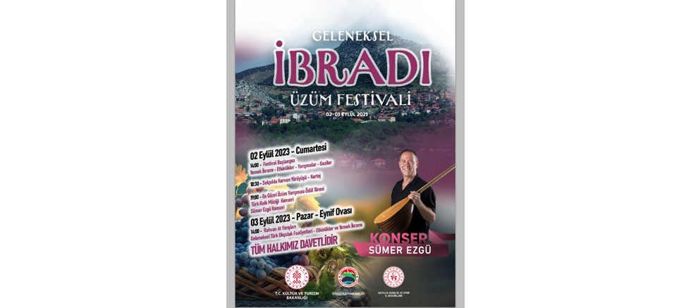 2 Eylül Cumartesi günü İbradı ilçe merkezinde başlayacak olan Geleneksel İbradı Üzüm Festivali’nin ilk gün programında yemek ikramı, yarışmalar, geziler ve çeşitli etkinliklerin yanı sıra Selçuklu Kervan Yürüyüşü-Kortej de yer alacak. En Güzel Üzüm Yarışması Ödül Töreni’nin yapılacağı ilk günün akşamında Türk Halk Müziği’nin değerli sanatçısı Sümer Ezgü, seslendireceği yöresel ezgilerle dinleyenlerine unutulmaz bir festival akşamı yaşatacak. Festival, 3 Eylül Pazar günü, uçsuz bucaksız güzelliği ve yılkı atlarıyla meşhur Eynif Ovası’nda yapılacak Rahvan At Yarışları, Geleneksel Türk Okçuluk Faaliyetleri, yemek ikramı ve çeşitli etkinliklerle son bulacak.