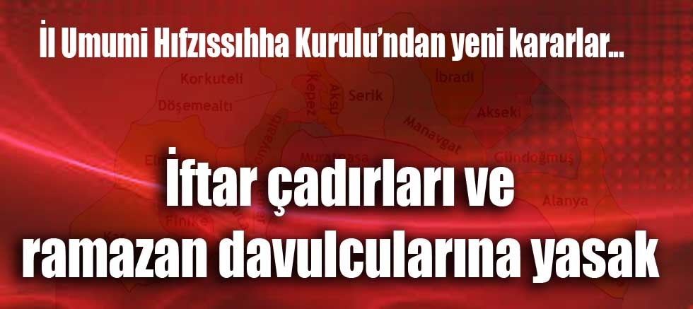 Antalya İl Umumi Hıfzıssıhha Kurulu'nda Koronavirüs kapsamında alınan kararlara göre, Ramazan ayında iftar, sahur gibi kalabalık grupları bir araya getiren etkinlik ve iftar çadırları yasaklandı. Ramazan ayında davulcular da evleri dolaşıp, bahşiş toplayamayacak.