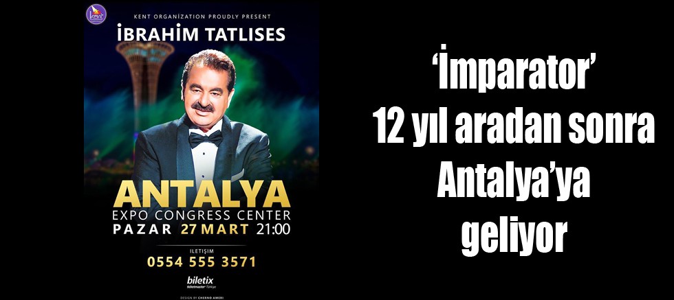 TÜRK müziğinin efsane ismi İbrahim Tatlıses, 12 yıl aradan sonra 27 Mart’ta Expo Kongre Merkezi’nde hayranlarıyla buluşuyor. Yaşadığı talihsiz olaydan dolayı uzun süren tedavi sürecinin ardından yeniden sahnelere dönen ‘İmparator’ lakaplı İbrahim Tatlıses, 12 yıl aradan sonra Antalya’da ilk konserine çıkacak.