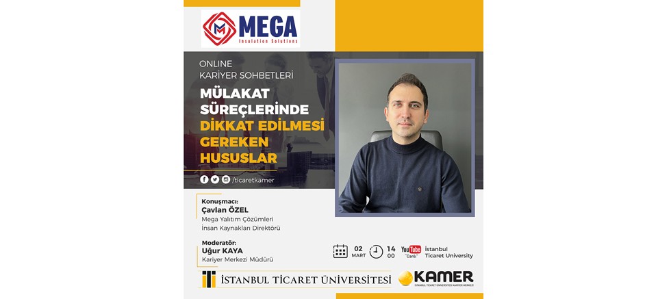 İstanbul Ticaret Üniversitesi Kariyer Merkezi KAMER ‘in düzenlediği Kariyer Sohbetlerinin bir yenisi 2 Mart 2023 tarihinde saat 14.00’te üniversitenin Youtube kanalı üzerinden gerçekleşecek. Moderatörlüğü’nü İstanbul Ticaret Üniversitesi Kariyer Merkezi Müdürü Uğur Kaya’nın üstlendiği online etkinliğin konusu ‘’Mülakat süreçlerinde dikkat edilmesi gereken hususlar’’ konuğu ise MEGA Yalıtım Çözümleri İnsan Kaynakları Direktörü Çavlan Özel.
