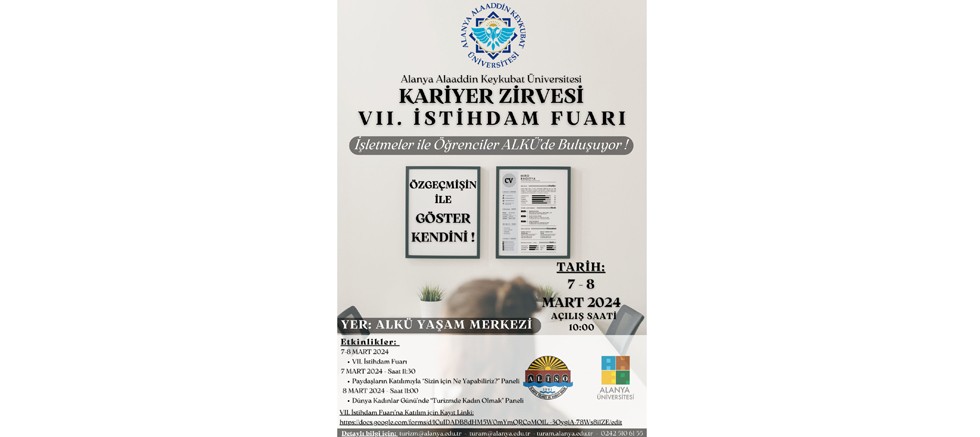 Alanya Alaaddin Keykubat Üniversitesinde 07-08 Mart 2024 tarihinde Kariyer Zirvesi ve VII. İstihdam Fuarı gerçekleştirilecek. Kariyer zirvesi ve istihdam fuarında birbirinden değerli sektör temsilcilerinin katılımı ile “Paydaşların Katılımıyla Sizin için Ne yapabiliriz” ve “ Turizmde Kadın Olmak” konulu paneller gerçekleştirilecek. Turizm Fakültesi Dekanı Prof. Dr. Burçin Cevdet Çetinsöz kariyer zirvesinin hedefine ilişkin şunları dile getirdi: “Alkü turizm fakültesi bünyesinde her sene kariyer zirvesi ve istihdam fuarı gerçekleştirmeye özen gösteriyoruz. Çünkü her bir Alkülü öğrencinin istiyoruz ki daha okuluna adım atar atmaz kendi alanıyla ilgili iş fırsatlarını görsün, deneyim edinsin ve yeni bağlantılar kurmanın yollarını öğrensin. Gençlerimizin kariyerine ışık tutmak ve onlara yol göstermek biz eğiticimlerin en önemli görevi. Kariyer Zirvesi ve VII. İstihdam Fuarında staj ve kariyer olanakları hakkında Alkü ’lü öğrencilerin ayrıntılı bilgi almaları, akademik eğitimleri ile yeteneklerine uygun pozisyonlara başvurmaları ve firmaların nitelikli insan kaynağına kısa sürede ulaşmaları adına büyük bir imkân sunmaktadır. Ayrıca zirve ve istihdam fuarı Dünya Kadınlar Gününe denk gelmektedir. Turizm hedeflerimize ulaşılması ve ülkemizin iddialı kalkınma hedeflerine ulaşabilmesinin kadınlarımızın ekonomik ve toplumsal hayat içinde daha fazla yer alması ile doğru orantılı olacağını düşünüyorum. Bundan dolayı turizm işletmelerinde, girişimcilikte ve inovasyonda kadınların önemine sürekli vurgu yapmak gerekmektedir. Ayrıca bu etkinlik başta olmak üzere tüm çalışmalarımıza destek veren Sayın Rektörümüz Prof. Dr. Ahmet Kenan Türkdoğan hocamıza teşekkürlerimi sunuyorum. Yine kariyer zirvesi ve istihdam fuarımızın hazırlık sürecinde bizlere destek olan Alanya Üniversitesi Rektörü Prof. Dr. Mesut Güner ve Alanya Ticaret ve Sanayi Odası Başkanı Eray Erdem’e çok teşekkür ediyorum.