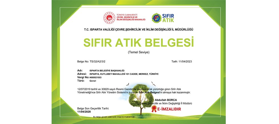 Isparta Belediyesi bu ve buna benzer istenen kriterleri yerine getirerek Sıfır Atık Belgesini Nisan ayı itibariyle Çevre Şehircilik ve İklim Değişikliği Bakanlığından almaya hak kazandı. Belge İl Müdürlüğü tarafından belediyeye teslim edildi.