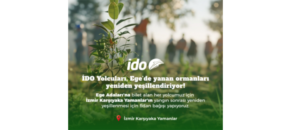 İstanbul Deniz Otobüsleri (IDO), Ege Bölgesi'nde yanan ormanları yeniden yeşillendirmek için örnek bir sosyal sorumluluk projesine imza atıyor. Çevreye duyarlılığını her fırsatta gösteren IDO, Türkiye Orman İşletmeleri İzmir Ağaçlandırma Bölge Müdürlüğü ile iş birliği yaparak, İzmir’in Karşıyaka Yamanlar ormanlık alanında yeni yeşil alanlar oluşturmayı hedefliyor. Bu kapsamda, Ege Adaları seferlerinden bilet alan her yolcu adına bir fidan bağışlanarak bölgedeki doğanın yeniden hayat bulmasına katkı sağlanıyor.