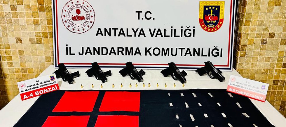 Antalya Valiliği İl Jandarma Komutanlığı ekiplerinin uyuşturucu madde imal ve ticaretine yönelik çalışmaları tüm hızıyla devam ediyor. Antalya Cumhuriyet Başsavcılığı talimatları doğrultusunda; Antalya İl Jandarma Komutanlığı İstihbarat Şube Müdürlüğü ve Kepez İlçe Jandarma Komutanlığı ekipleri tarafından silah ticareti ve uyuşturucu madde imal ve ticaretine yönelik bir operasyon düzenlendi. Operasyonda A.K. ve V.Y. isimli şahısların il dışından getirdikleri ruhsatsız tabancaları ve uyuşturucu maddeleri Kepez ilçesinde piyasaya süreceklerinin bilgisinin alınması üzerine yapılan aramada; 5 adet ruhsatsız tabanca, 5 adet tabanca şarjörü,13 adet 9 mm çapında fişek, 20 paket satışa hazır 100 gram metamfetamin, 500 içimlik A4 sentetik cannabinoid uyuşturucu maddenin ele geçirildiği belirtildi.
