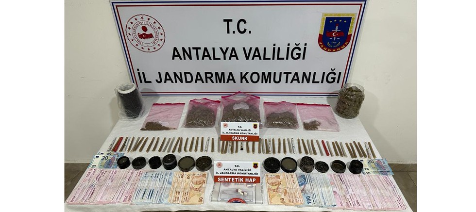 Antalya Valiliği İl Jandarma Komutanlığı ekiplerinin uyuşturucu madde imal ve ticaretine yönelik çalışmaları tüm hızıyla devam ediyor. Manavgat Cumhuriyet Başsavcılığı talimatları doğrultusunda; Antalya İl Jandarma Komutanlığına bağlı KOM Şube Müdürlüğü ve Manavgat İlçe Jandarma Komutanlığı ekipleri tarafından Manavgat ilçesinde uyuşturucu madde sattığı tespit edilen bir şüpheli şahsa operasyon düzenlendi. Side bölgesinde yakalanan şüpheli şahsın, ikametinde yapılan aramada; 1050 gram skunk esrar maddesi, 56 adet satışa hazır halde içimlik skunk, 6 adet sentetik hap, 9 adet uyuşturucu madde öğütme aparatı, suç gelirinden elde edilen 44.000 TL ve 80 Euro’nun ele geçirildiği belirtildi.