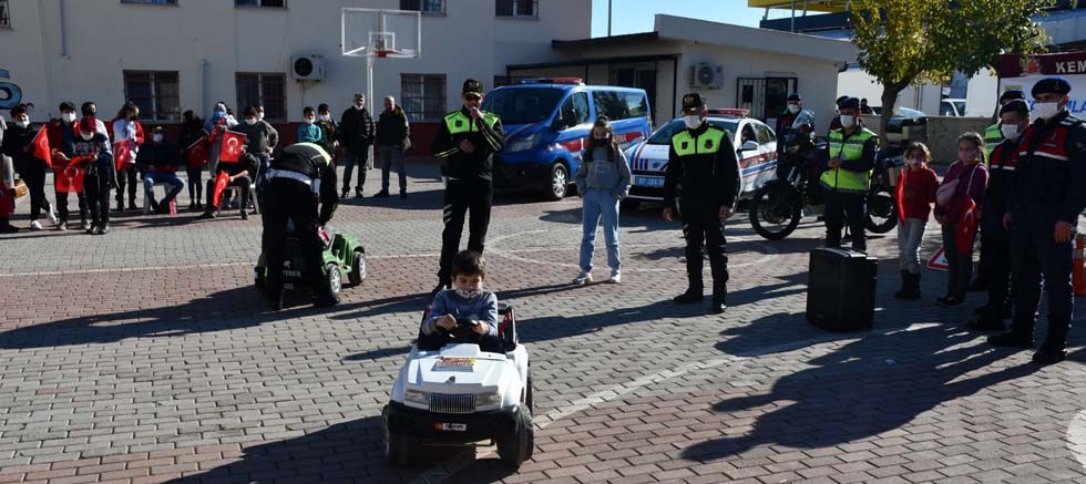 Trafik timleri, bilgilerin ardından okul bahçesinde hazırlanan platformda çocuklara uygulama yaptırdı.