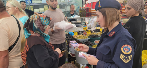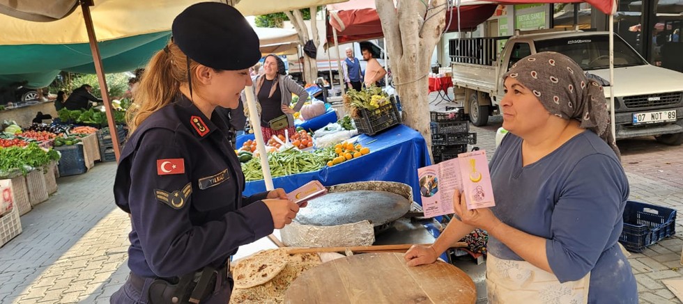 "Alanya İlçe Jandarma Komutanlığına bağlı Aile İçi Şiddetle Mücadele ve Çocuk Kısım Amirliği ve Alanya İlçe Jandarma Komutanlığı Mahmutlar J.Krk.K.lığı personelince Mahmutlar Mahallesinde kurulan pazar yerinde kadınlara Aile İçi Şiddet, KADES ve Teknik Araç ve Yöntemlerle Takip uygulaması olan Elektronik