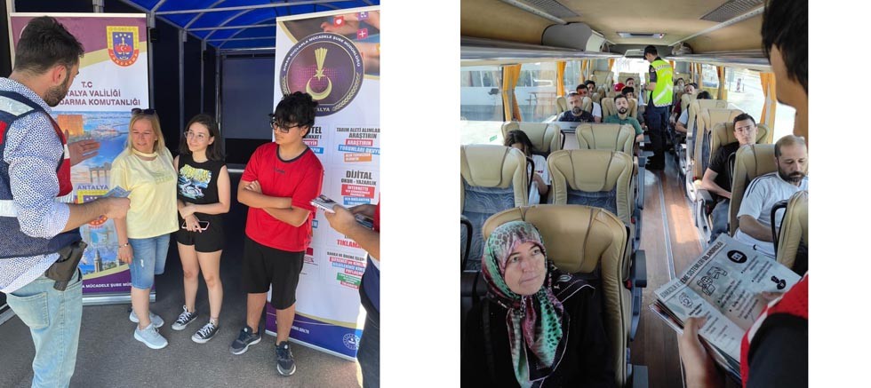"Antalya İl Jandarma Komutanlığı Siber Suçlarla Mücadele Şube Müdürlüğü personeli tarafından “Yasadışı Bahis, Bankacılık ve Ödeme İşlemleri Dolandırıcılığı, Çocuklar için Güvenli İnternet ve İnternette Doğru Bilgiye Ulaşmak“ konularında 05.07.2022 tarihinde Döşemealtı İlçe J.K.lığı Kovanlık J.Krk.K.lığı yol kontrol noktasında vatandaşlara bilgi verilmiş ve broşür dağıtımı yapılmıştır.