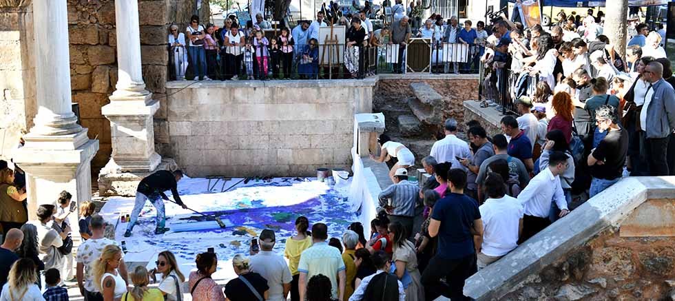 Bir diğer çarpıcı performans ise Prof. Dr. Orhan Cebrailoğlu’nun “Göç döngüsü” çalışmasıydı. Cebrailoğlu, Hadrian Kapısı’nda rengarenk boyalarla göçün hem kişisel hem de toplumsal hafızadaki izlerini simgeleyen dinamik bir tablo yaptı. Soyut ve lirik bir dille kendi duygularını bir müzik eşliğinde tuale taşıyan Cebrailoğlu, kendisinin de bir otuz yıl önce Azerbaycan topraklarından geldiğini, göçün kendi yaşamında da derin izler bıraktığını vurgulayarak, bu performansla tarihin ve kişisel travmaların kesiştiği noktada göçün yarattığı döngüyü izleyicilere sundu.