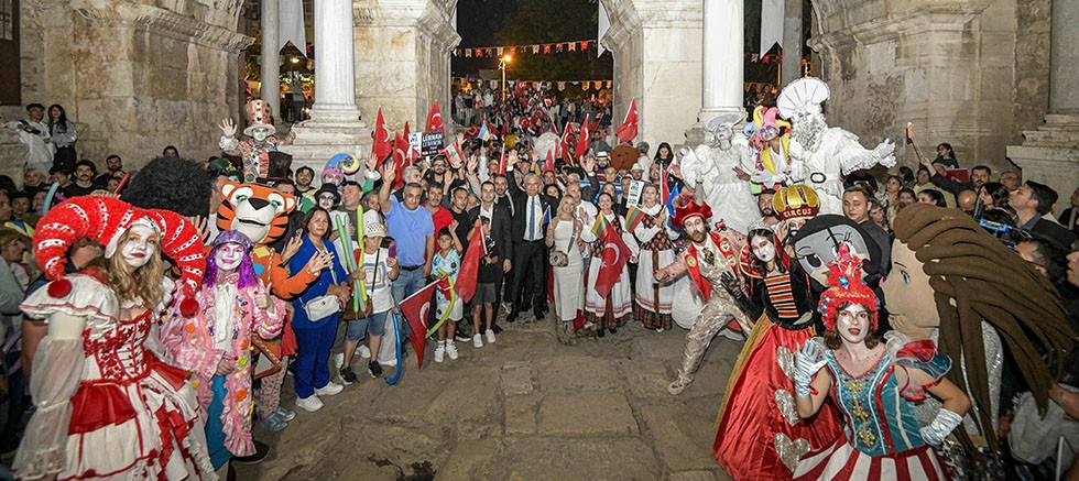 Başkan Uysal’ın konuşmasının ardından, festivale katılan şehirler, geleneksel kostümleri, ellerinde kendi ülkelerinin bayrakları ve Türk bayraklarıyla sahnede Antalyalıları selamladı.