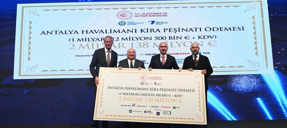 Ulaştırma ve Altyapı Bakanı Adil Karaismailoğlu, Antalya Havalimanı Projesi’ni kazanan konsorsiyumun kira bedelinin 2 milyar 138 milyon avroluk peşinatını ödediğini duyurdu.
