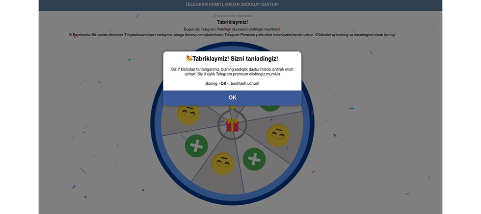 Örneğin saldırganlar Telegram Premium abonelikleri için sahte "eşantiyonlar" hazırlıyor. Mağdurlardan bu eşantiyonu almak için Telegram hesap kimlik bilgilerini girmeleri isteniyor ve kimlik avı sitesine yönlendiriliyor. Sonuçta kullanıcı kendinden istenenleri yaparsa, hesapları ele geçiriliyor.