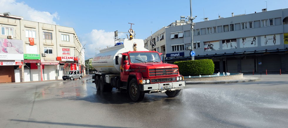 Belediye ekipleri, ana arterleri arazözle dezenfekte yapmak dışında rutin olarak ilçe genelinde çalışmalarına hızla devam ediyor.