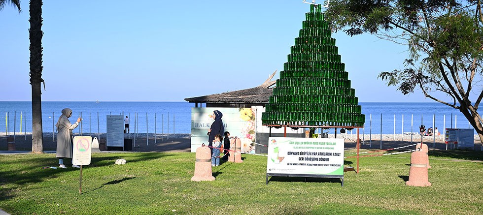 Kemer Belediyesi İklim Değişikliği ve Sıfır Atık Müdürlüğü'nün çevre temizliği, geri dönüşümün teşvik edilmesi ve farkındalık oluşturmak amacıyla cam şişelerden tasarlanan yılbaşı ağacı büyük ilgi görüyor.