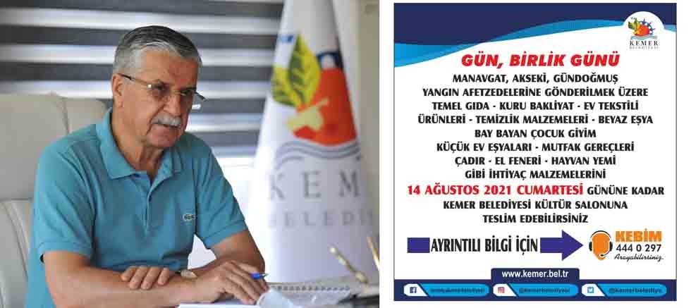 Kemer Belediyesi “Gün, birlik günü” adı altında Manavgat, Akseki ve Gündoğmuş’ta Orman yangını ile zarar gören afetzedeler için bir yardım kampanyası başlattı.