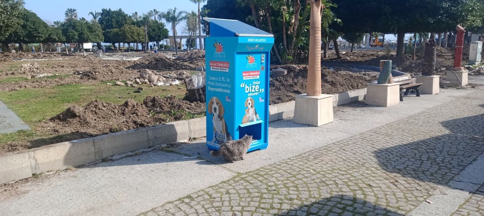 Kemer Belediyesi, sokak hayvanlarının beslenmesini kolaylaştırmak amacıyla ilçede belirlenen yerlere mama kumbaraları monte etti.