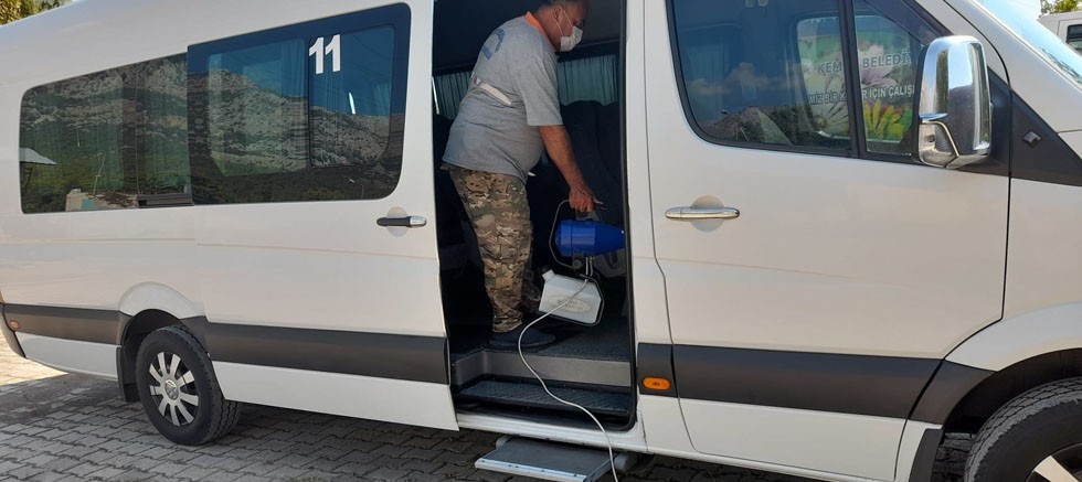 Kemer Belediyesi, yeni eğitim ve öğretim yılının başlamasıyla beraber ilçedeki okul servislerini dezenfekte ediyor.
