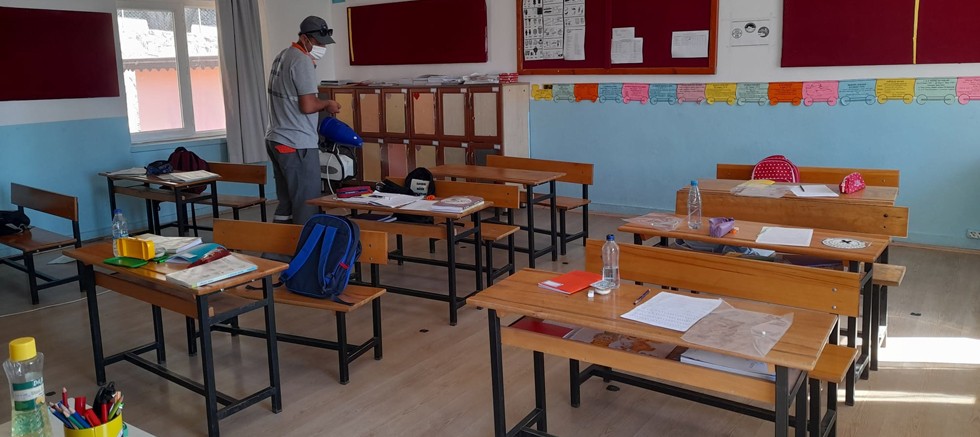 Belediye ekipleri, ilçedeki okullarda ders bitiminden sonra sınıflarda ve okul bahçelerinde dezenfektan çalışması yapıyor.