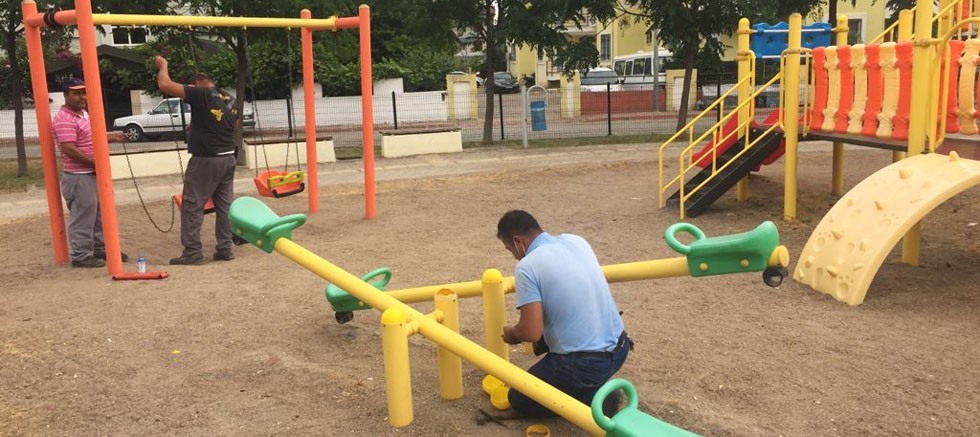 Belediye ekipleri, parklarda hasar gören kaydırak, salıncak, bank, spor aletleri, oyun grupları ve kırık olan pergoleleri yeni ile değiştiriyor.