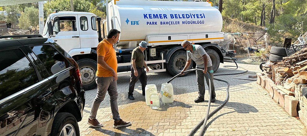 Tekirova Mahallesi’nin bazı bölgelerinde yaşanan su kesintileri nedeniyle Kemer Belediye ekipleri vatandaşların mağdur olmaması için su tankeriyle su taşıyor.