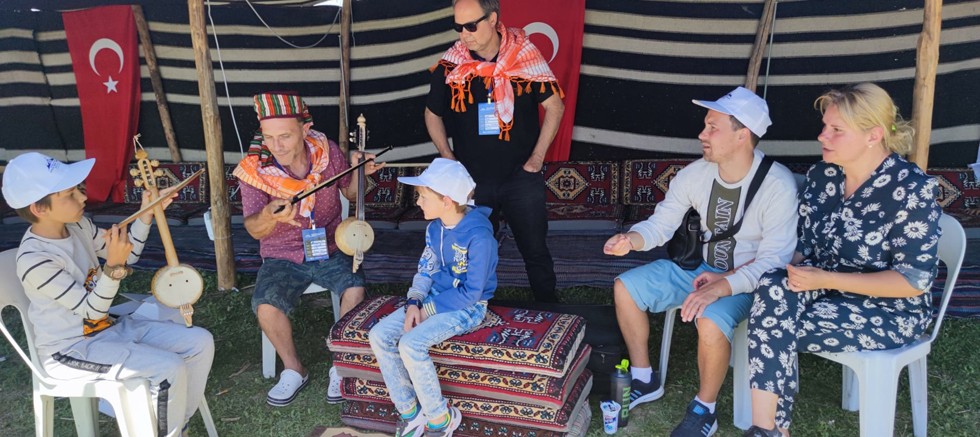 Kemer Belediyesinin açtığı yörük çadırına gelen yabancı misafirler, Göynük Mahallesinde yaşayan kemane ustası Mustafa Uğur’un çaldığı eserleri dikkatle dinliyor.