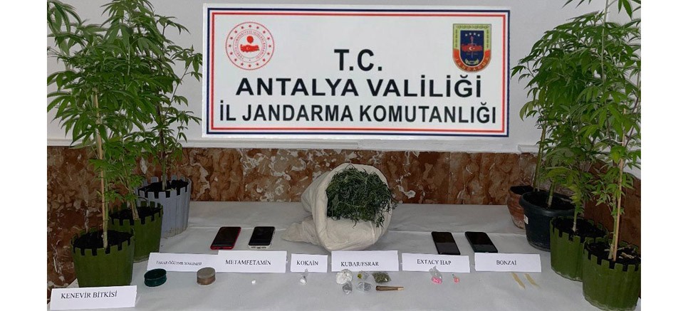 Vatandaşların huzur ve güvenliği için operasyonlarına hız kesmeden devam eden Antalya Valiliği İl Jandarma Komutanlığı ekipleri başarılı operasyonlarına bir yenisini ekledi. Kemer Cumhuriyet Başsavcılığı talimatları doğrultusunda; Antalya İl Jandarma Komutanlığı ekiplerince Kemer ilçesine bağlı Çıralı, Tekirova ve Beldibi turizm bölgelerinde uyuşturucu madde imal ve ticareti, uyuşturucu madde kullanma ve bulundurma suçu işleyen 17 kişinin tespit edilmesi üzerine bir operasyon düzenlendi. Düzenlenen operasyonda; 3100 gram kubar esrar, 1 adet esrar öğütücü, 18 kök kenevir bitkisi, 15 adet sentetik hap, 20 gram metamfetamin, 10 gram kokain, 100 kullanımlık sentetik kannabinoid (bonzai) ve 4 adet cep telefonunun ele geçirildiği ifade edildi.