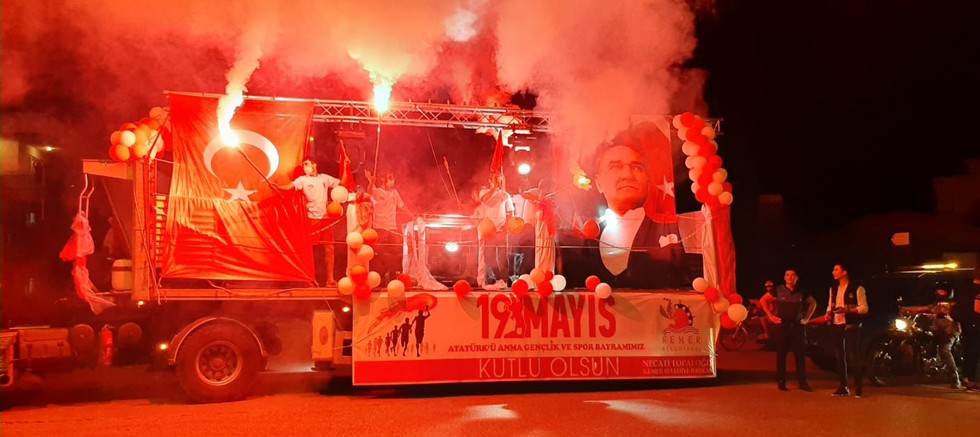 Kemer Belediyesi Kültür ve Sosyal İşler Müdürlüğü ekipleri, hazırladığı tır ile 19 Mayıs Atatürk’ü Anma Gençlik ve Spor bayramını ilçe genelinde sokak sokak dolaşarak kutladı.