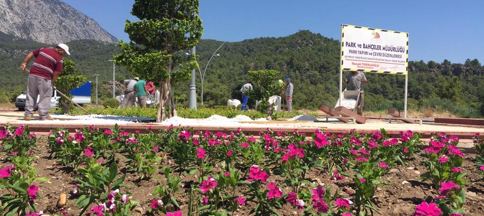 Türkiye'nin en önemli turizm merkezlerinden biri olan Kemer'in çevresinin daha düzenli ve estetik görünmesi için çalışan belediye ekipleri, orta refüjlerde ve belediye binasının çevresinde düzenleme çalışmalarını tamamladı.