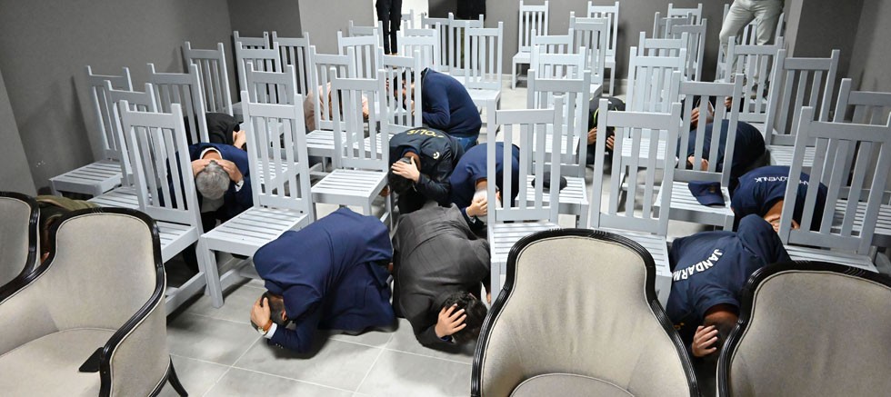 Kaymakam Çam, Başkan Topaloğlu ve beraberindekiler, saat 18.57’de telefonlara gelen bildirim sonrası “çök kapan tutun” hareketini yaptı.