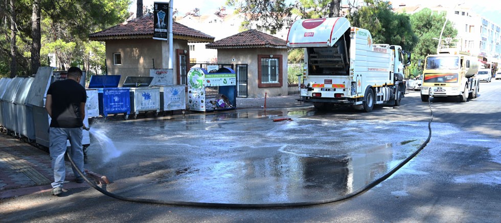 Kemer Belediyesi Temizlik İşleri Müdürlüğü ekipleri, ilçe genelinde bulunan çöp konteynerlerini yıkayarak dezenfekte ediyor. Çalışmaların ardından temizlik işleri müdürlüğü çöp konteynerlerinin bulunduğu alanı ilaçlıyor. Park ve Bahçeler Müdürlüğü ekipleri de alanı temiz suyla yıkıyor.