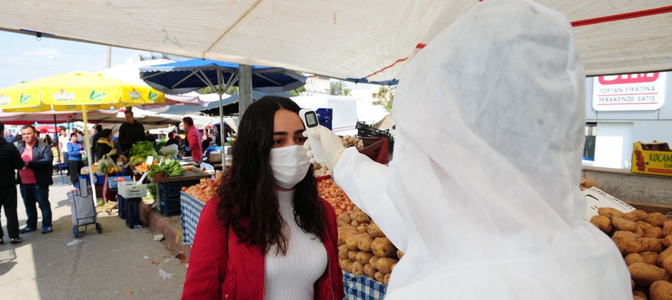 Belediye binasının giriş ve çıkışlarında yapılan ateş ölçümlerini uygulayan belediye ekipleri, çok sayıda vatandaşın geldiği pazar yerlerinde de ateş ölçümlerine devam ediyor.
