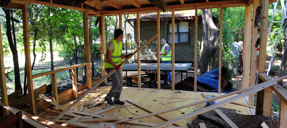Yeni tip koronavirüs (Kovid-19) salgını nedeniyle ara verilen yıkımına yeniden başlayan belediye ekipleri, Çıralı’da kaçak yapılan bungalovları yıkıyor.