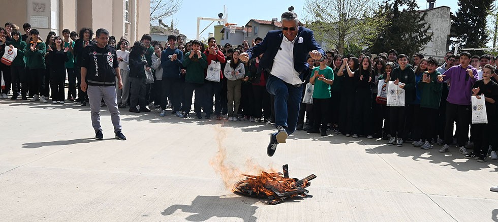 Başkan Topaloğlu, Nevruz Bayramı kutlamaları kapsamında, okul bahçesinde yakılan nevruz ateşinin üzerinden atlayarak, demir dövdü. Başkan Topaloğlu’na öğretmen ve öğrenciler de eşlik etti.