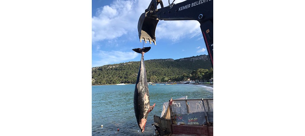 Kemer’de yaklaşık 3 metre uzunluğunda ölü yunus balığı sahile vurdu. Kemer Belediye ekiplerinin yaptığı inceleme sonrası ölü yunus balığı bulunduğu yerden kaldırıldı.