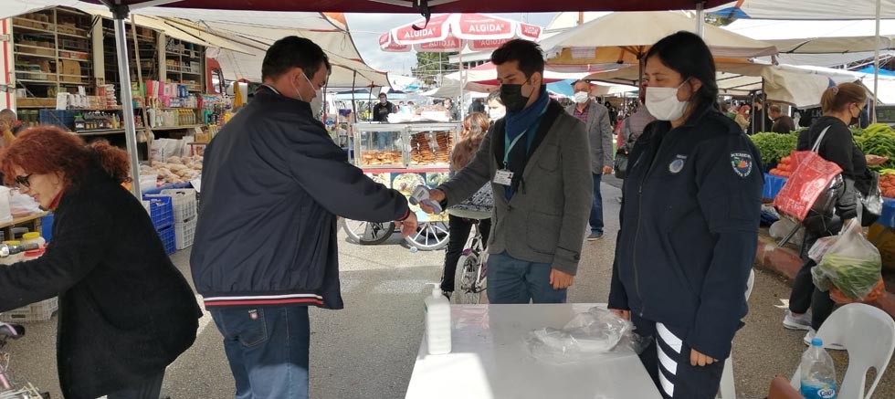 Belediye ekipleri, ilçe genelinde belirlenen günlerde kurulan pazar girişlerinde halkın ateşini ölçüyor, maske dağıtıp vatandaşların ellerinin dezenfekte edilmesini sağlıyor.