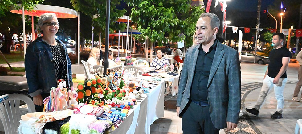 Kermeste tezgah açan ev hanımlarını ziyaret eden Kemer Belediye Başkan Yardımcısı Mehmet Derya Baytekin, ev hanımlarının ürünlerini inceleyerek hayırlı işler dileklerinde bulundu.