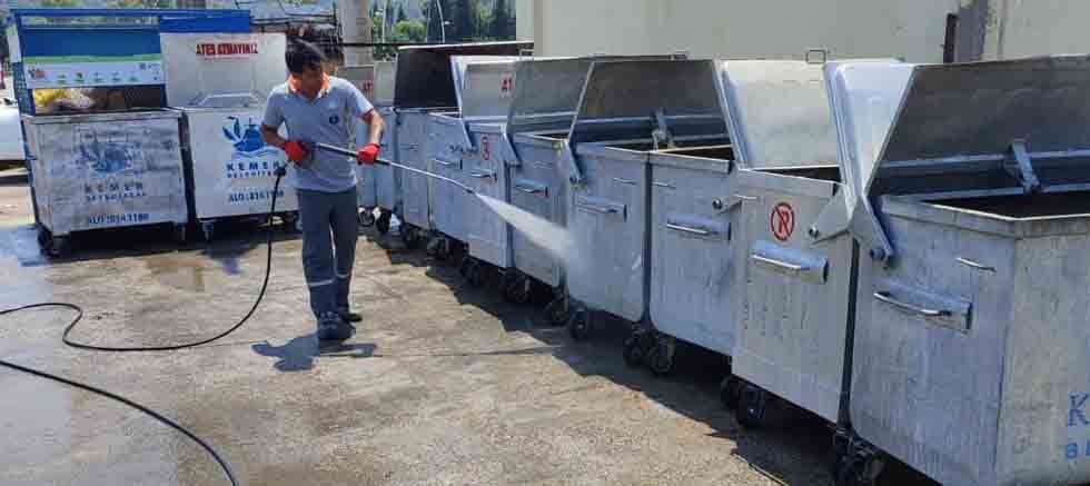 Bayramda yaşanan yoğunluk nedeniyle çok fazla kirlenen çöp konteynerleri, belediye ekipleri tarafından yıkanarak dezenfekte edildi.