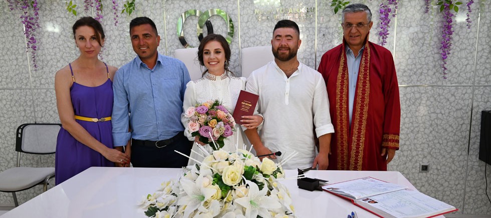 Kemer Belediye Başkanı Necati Topaloğlu'nun kıydığı nikahta, 'Hiçbir baskı altında kalmadan evlenmek istiyor musunuz' sorusuna çift Türkçe olarak 'Evet' karşılığını verdi.
