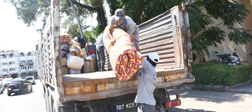 Kemer Belediyesine getirilen beyaz eşya, yorgan, yastık, battaniye, döşek, televizyon, mutfak eşyaları, temel gıda maddeleri, giyim eşyaları, ilaç, kişisel bakım ürünleri, halı, perde, oyuncak, ayakkabı, havlu, çocuk bezi, içecek, hijyen ürünleri gibi yardım malzemeleri, kategorilerine göre ayrıldıktan sonra araçlara yükleniyor.