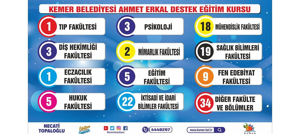 Kemer Belediyesi tarafından ücretsiz olarak sunulan Ahmet Erkal Destek Eğitim Kursu, öğrencilere hem akademik hem de sosyal yönden katkı sağlamaya devam ediyor. Kemer Belediyesi Ahmet Erkal Destek Eğitim Kursu’nda üniversite sınavına ücretsiz hazırlık kursu alan öğrenciler her yıl olduğu gibi bu yıl da Kemer’e büyük bir gurur yaşattı.