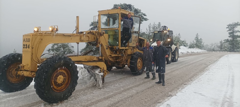 Kemer’in yüksek kesimlerinde karla kaplanan yollar, Kemer Belediye ekipleri ve iş makineleri yardımıyla açılıyor.
